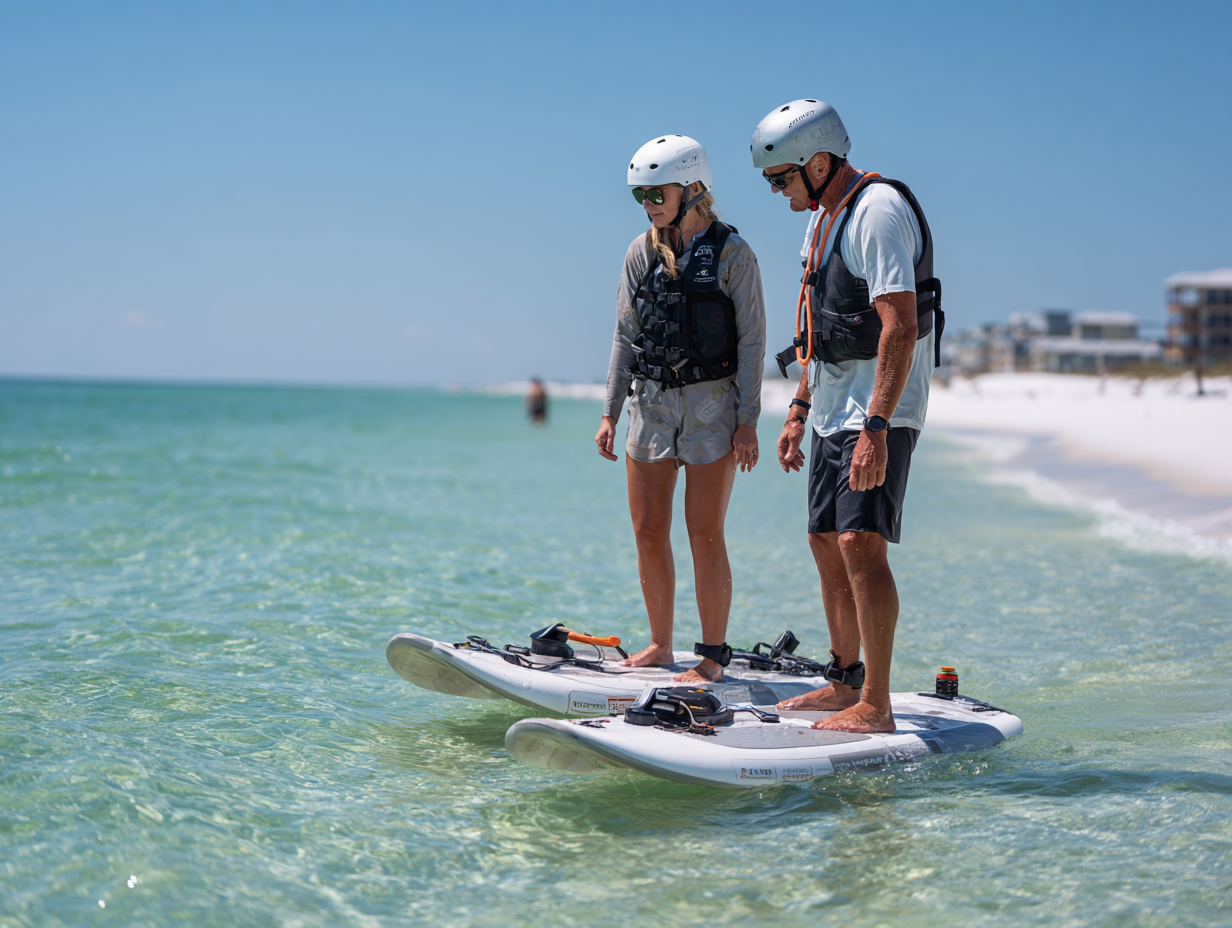 No experience needed. Our instructors guide you through every step—from safety briefing to your first moment above the water. You'll spend ninety minutes learning the fundamentals, getting comfortable on the board, and flying in calm, protected waters. By the end, you'll understand why eFoiling is the most exhilarating way to experience the Gulf.